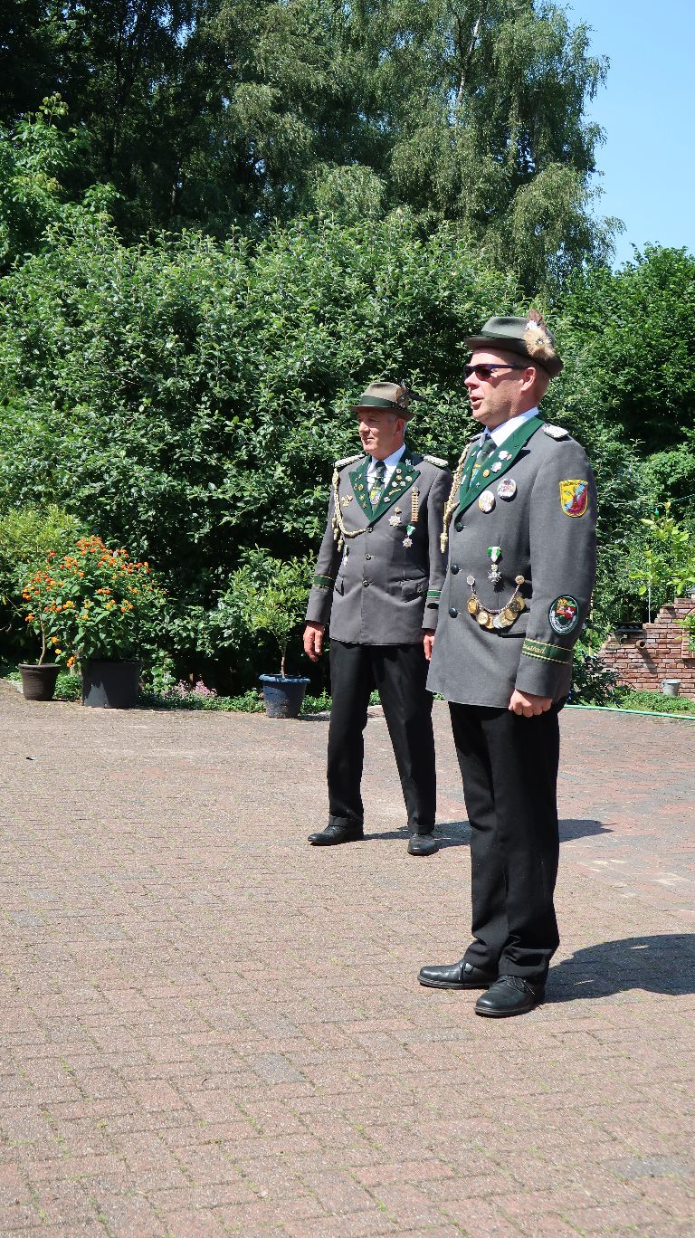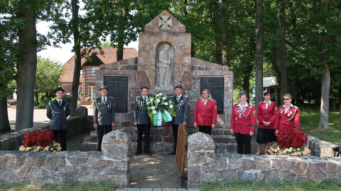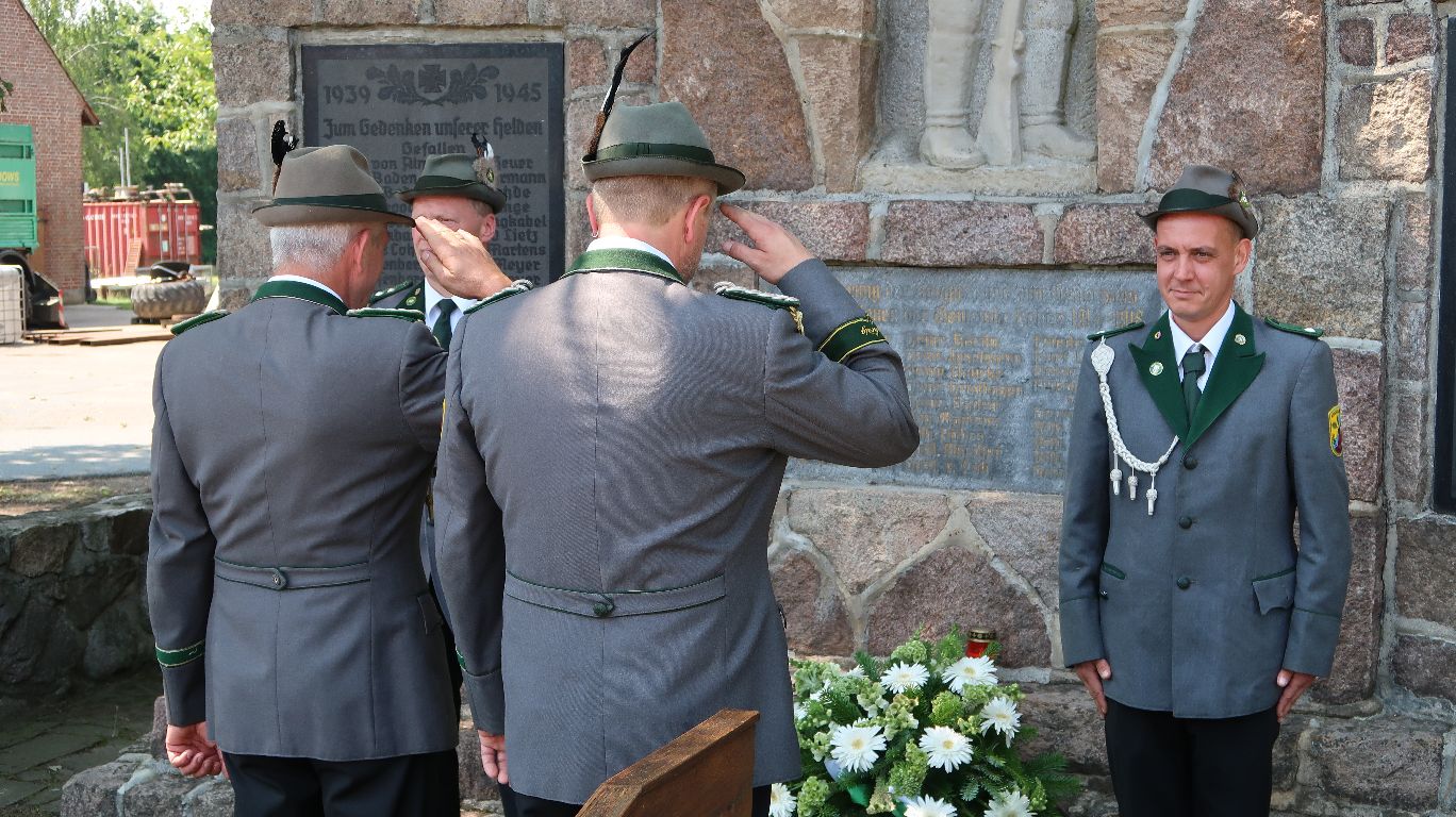 Nichtsdestotrotz fand sich wieder eine Abordnung des Vereins am Schützenfest Samstag vor dem Kriegerdenkmal ein. Zusammen wurde ein Blumenkranz zum Gedenken an die Verstorbenen der vergangenen Weltkriege niedergelegt.
