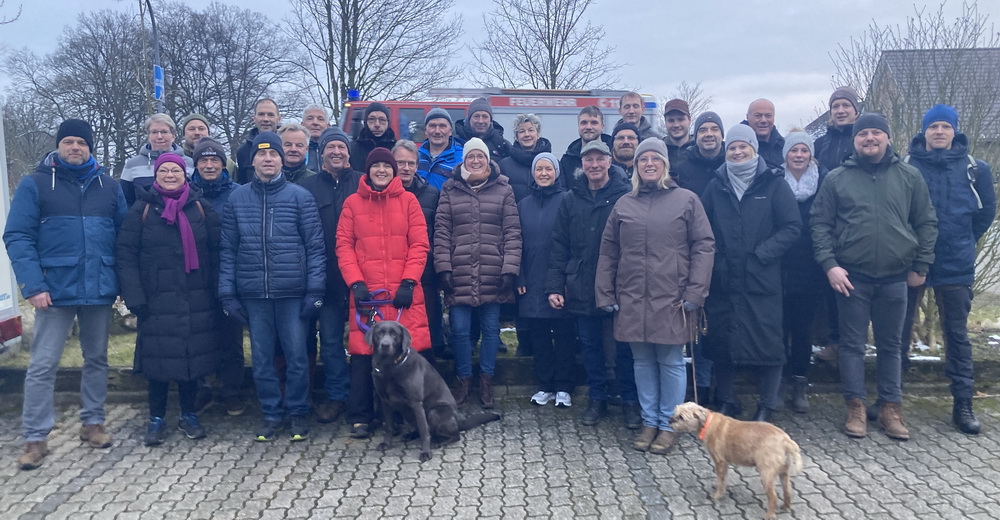 Die Teilnehmer der Mondscheinwanderung haben mit dem Gruppenbild exakt so lange gewartet, dass die drei noch fehlenden Feuerwehrleute zumindest im Auto mit auf dem Foto zu sehen sind. Eine technische Hilfeleistung hatten die Kameradinnen und Kameraden zuvor im Eiltempo abgearbeitet.